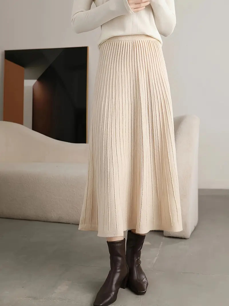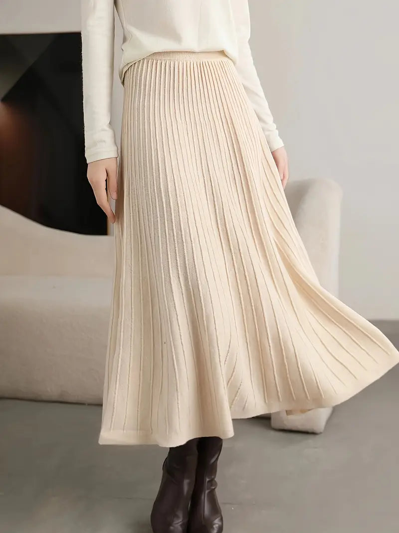 Dieser Strickrock in Beige zeigt eine schlichte Silhouette mit vertikalen Falten, die vom Bund bis zum Saum verlaufen. Die mittlere Länge macht ihn vielseitig einsetzbar, während die Struktur optische Tiefe verleiht. Der Bund sitzt auf natürliche Weise in der Taille und formt die Linie ohne zusätzliche Verschlüsse. Der ausgestellte Schnitt sorgt dafür, dass der Stoff in gleichmäßigen Falten fällt und ein ausgewogenes Gesamtbild entsteht.
