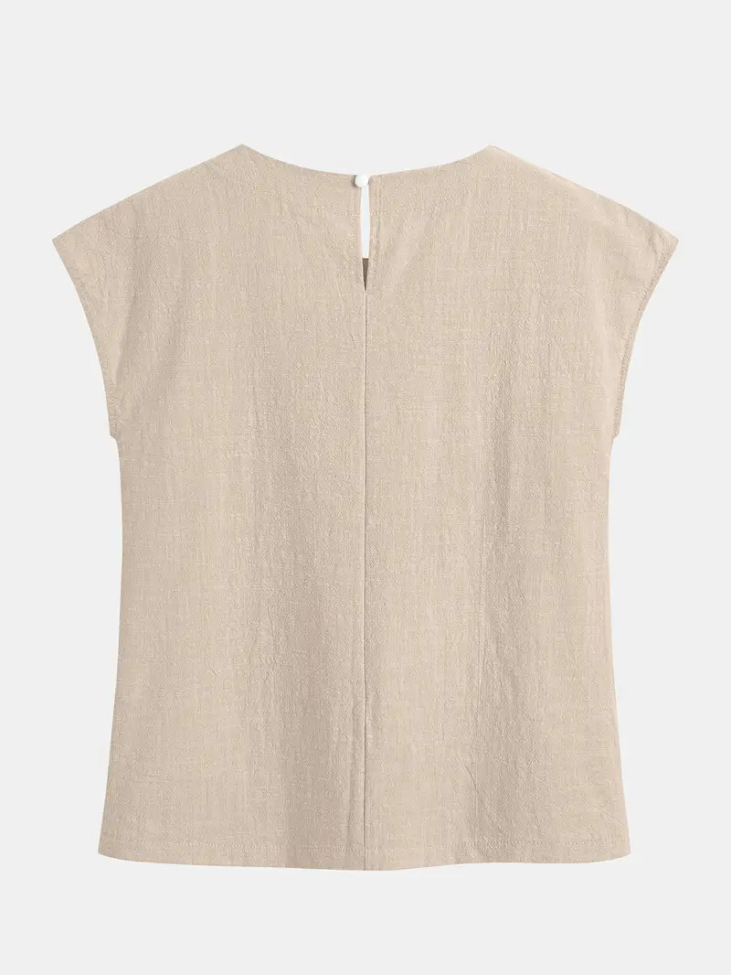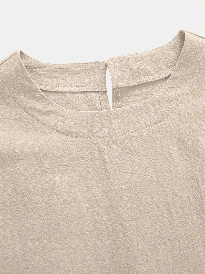 Diese Damenbluse besteht aus einer Leinenmischung und zeigt sich in einem beigefarbenen Ton. Sie ist gerade geschnitten, mit rundem Halsausschnitt und kurzen Kappärmeln. Ein unauffälliger Knopfverschluss am Rücken sorgt für einen sauberen Abschluss. Die feine Struktur des Materials verleiht ihr eine natürliche Ausstrahlung und macht sie vielseitig kombinierbar mit Röcken und Hosen.